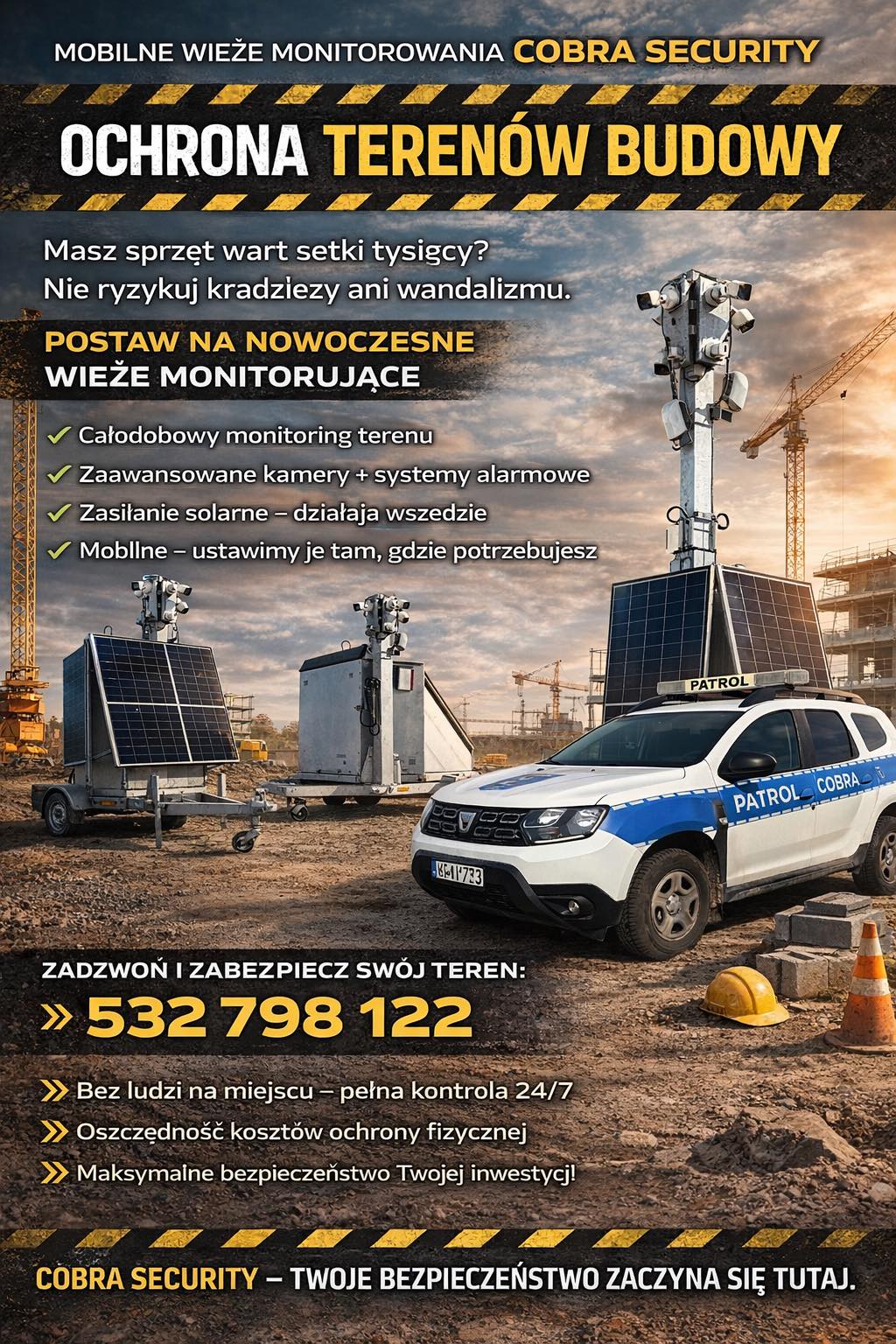 Poszukujesz skutecznego i elastycznego rozwiązania zabezpieczającego? Wynajem wież do monitoringu to nowoczesna alternatywa dla tradycyjnej ochrony fizycznej, oferująca do 70% oszczędności przy zachowaniu najwyższej skuteczności ochrony. Nasze mobilne wieże monodobowy nadzór nad Twoim obiektem bez konieczności budowy stałej infrastruktury. Mobilne maszty do monitorowania stanowią rewolucyjne rozwiązanie dla firm i instytucji wymagających szybkiego wdrożenia systemu bezpieczeństwa. Dzięki zaawansowanej technologii i pełnej autonomii energetycznej, wieże do monitoringu mogą być uruchomione nawet w ciągu 24 godzin od złożenia zamówienia